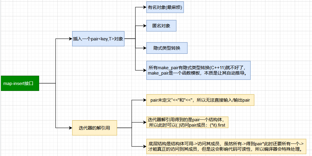 前面我们插入的都是一个数据类型,而这里插入的是一个为(key,value)类型即pairl类型【这里并没有将两个数据分开插入而是同时插入,前面实现搜索二叉树是分开来插的】,这也就意味着map的迭代器无法解引用(要调用operator*重载函数,该函数无法实现返回两个值)。