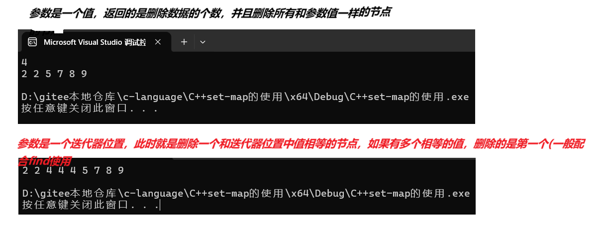 这里我们也是通过其参数进行解析,如果参数是一个值,就删除所有对应值的节点(其他两种情况和set一样),所以在multiset种如果只想删除一个就要用find进行配合,如果想删除所有与值相同的就直接参值即可。