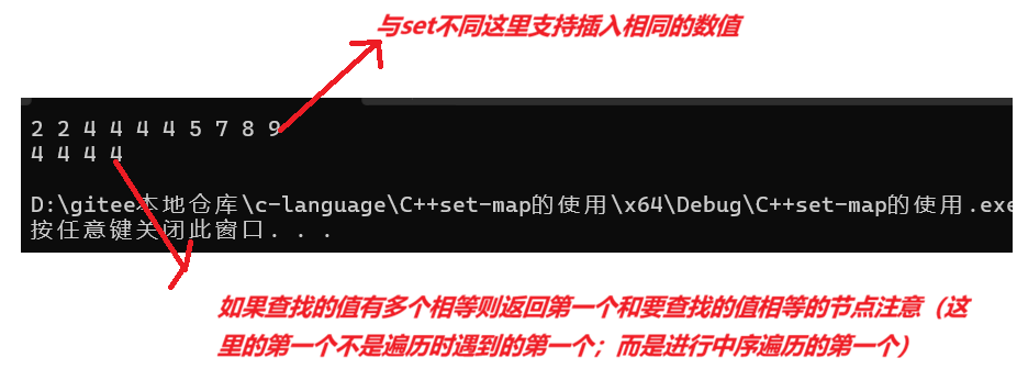 由于multiset支持插入重复的数据,所以在查找一个值时可能有多个,那它返回的时哪个呢(是遍历时遇到的第一个;还是进行中序遍历的第一个)注意这里返回的时中序的第一个。