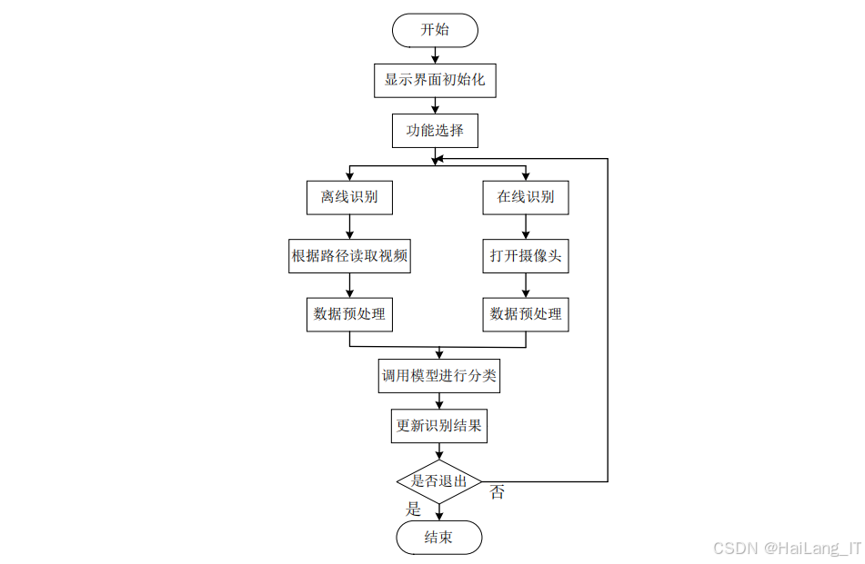 功能选择:界面提供了明确的功能选择按钮,用户可以根据需求选择实时识别或离线识别功能。实时识别模式通过摄像头采集视频流进行实时处理和识别;离线识别模式则读取本地视频文件进行分析。