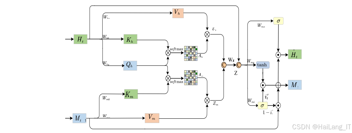 自注意力记忆ConvLSTM:ConvLSTM结合了卷积神经网络和长短期记忆网络的优点,能够有效处理时空序列数据。传统的ConvLSTM在建模长期依赖关系时存在一定局限性。本研究引入自注意力记忆模块,通过门控机制动态更新记忆单元,选择性地聚合全局特征信息。自注意力记忆模块能够有效捕捉视频中的长距离依赖关系,提高模型对时序信息的建模能力。