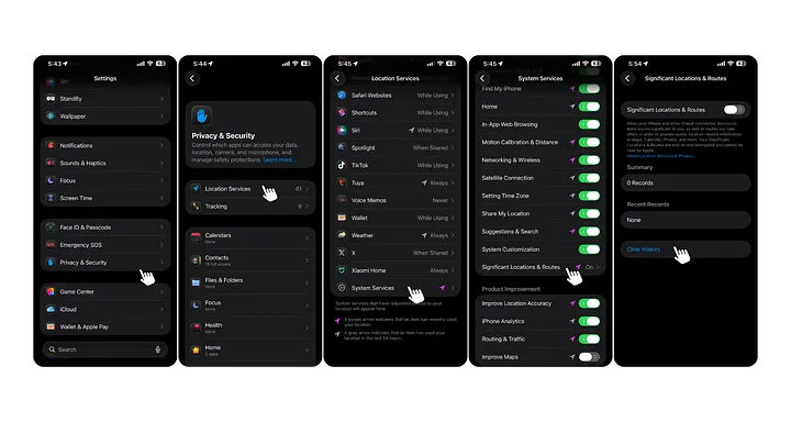 清空历史记录: 在"重要地点"页面往下滑到最底部,点红色的 Clear History(清除历史记录),确认后,那些记录会消失。