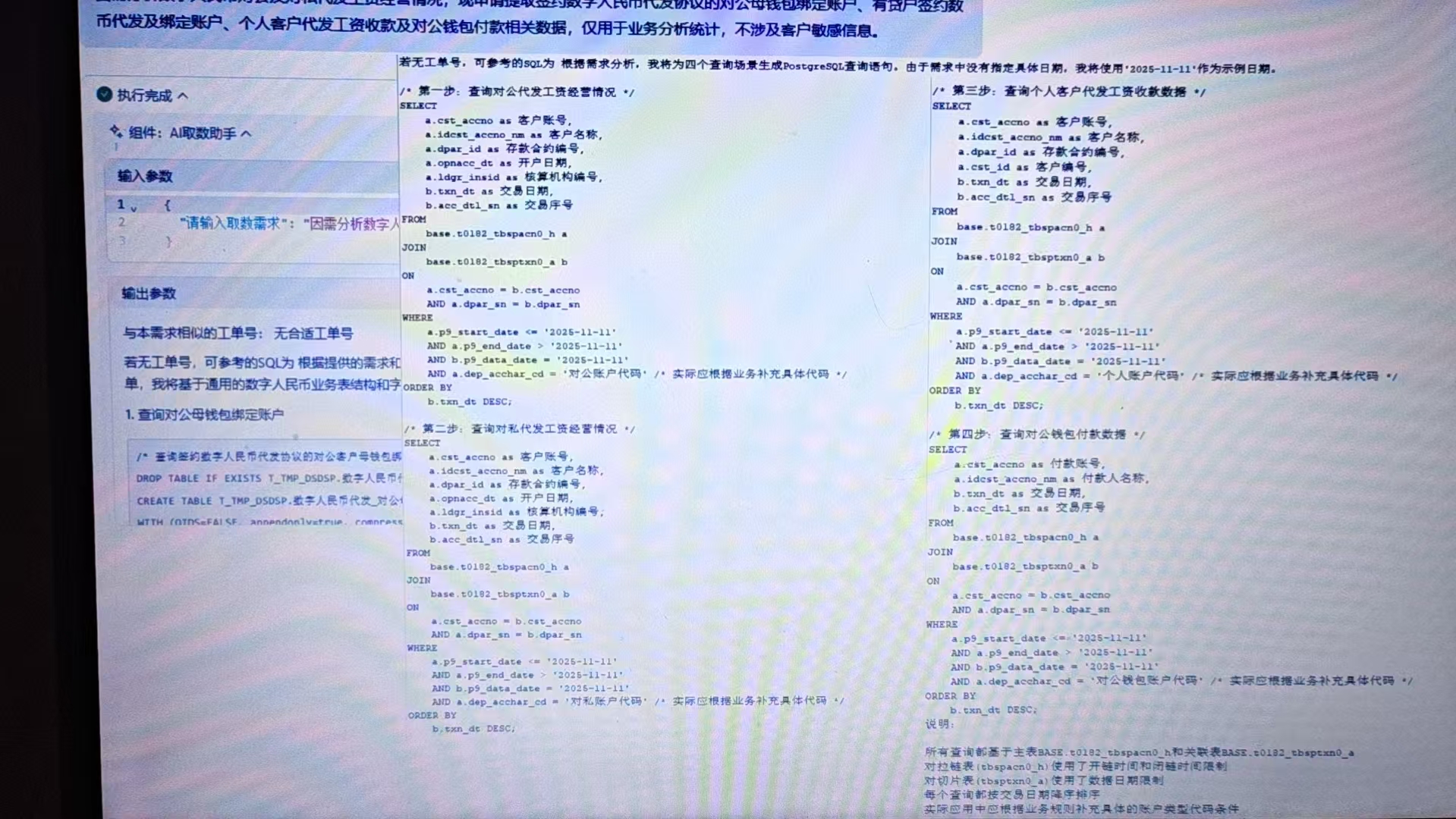 ai取数助手的意义在于能够根据业务需求自动生成SQL,供数据人员参考和使用,同时一些重复时间重复需求等季报问题,可以无缝沿用原有脚本出数,降低重复开发沟通时间