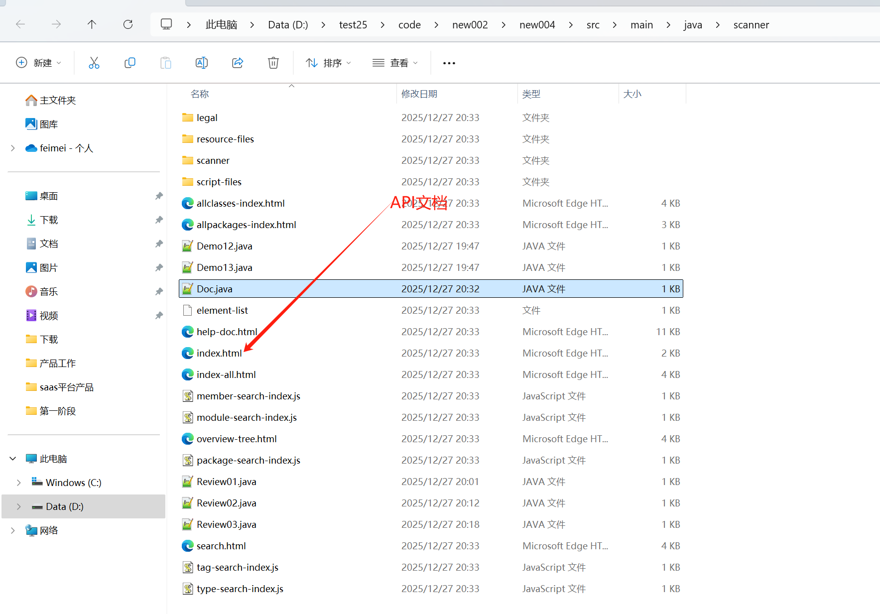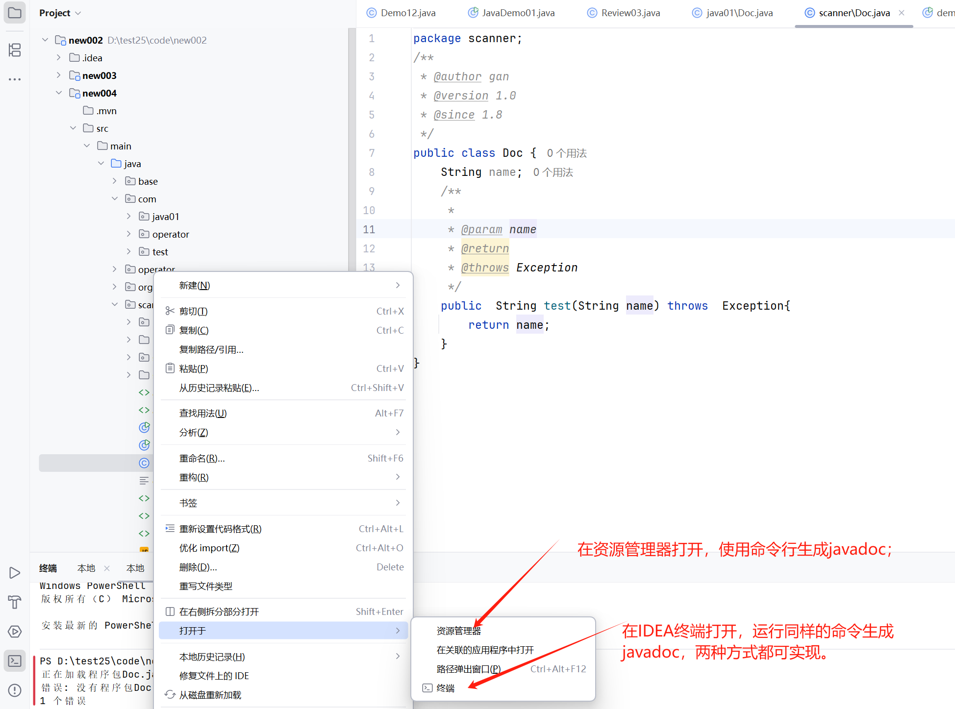 - 选择这个Doc.java文件,然后鼠标右键,选择打开于-》资源管理器,就能打开文件所在路径,路径处输入cmd命令行;