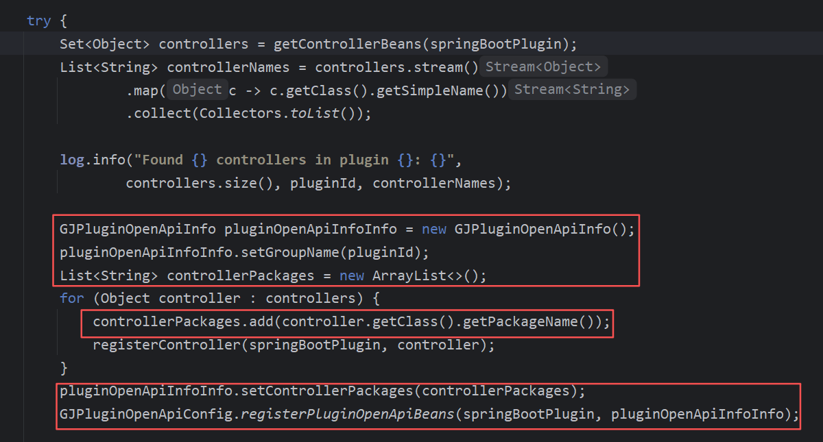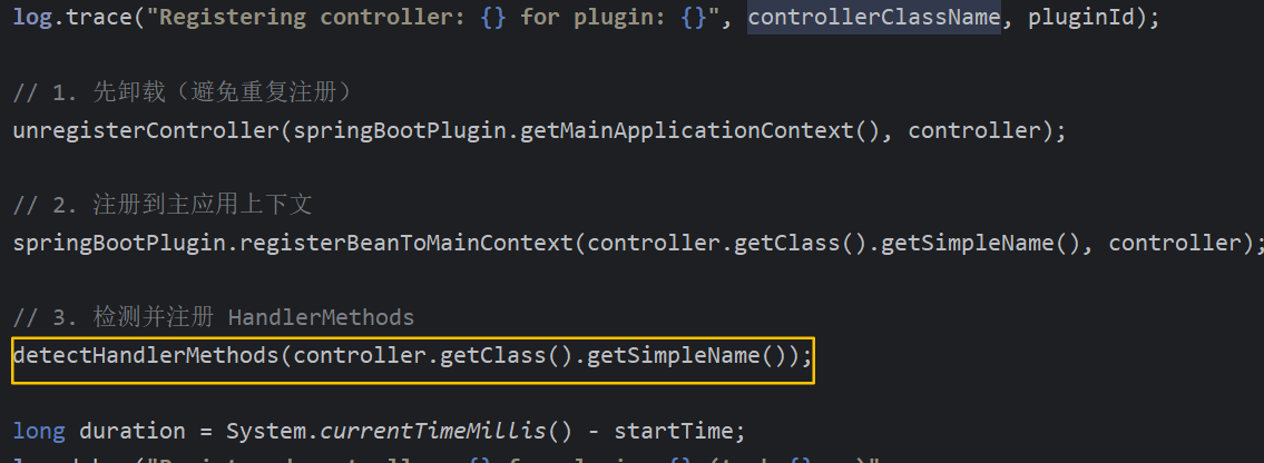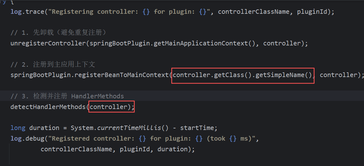 上述严格判断插件控制器方法的bean到底是不是属于对应的控制器,于是我们回过头去看我们动态注册控制器的bean和将控制器的方法注册到请求处理映射的逻辑,如下再重点标识一下,以免小伙伴们忘记了