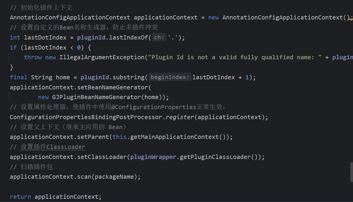 每个插件有独立的上下文,所以在启动插件时需创建插件上下文,完成创建插件上下文分为4个步骤,一是初始化上下文,二是提供上述抽象开发者可重写的手动注册,三是刷新插件上下文,四是上述插件利用上下文进行相关业务初始化操作