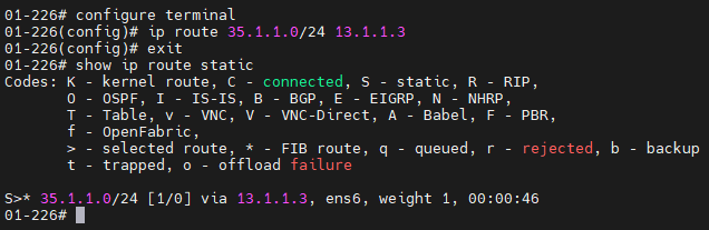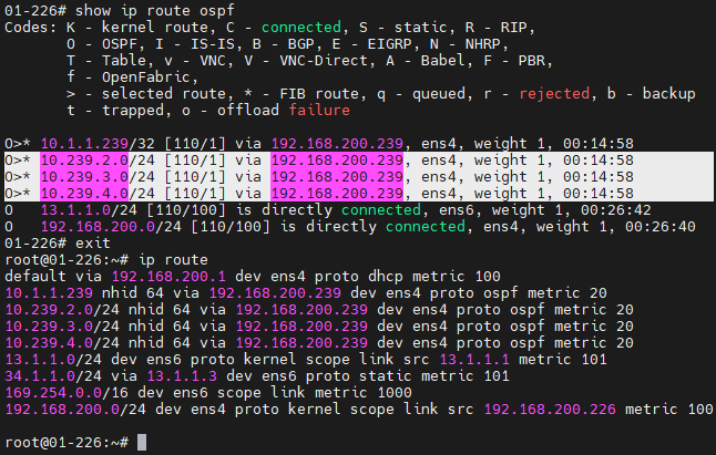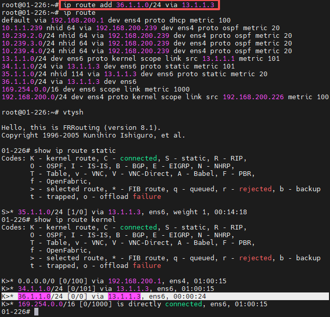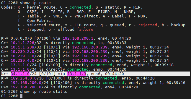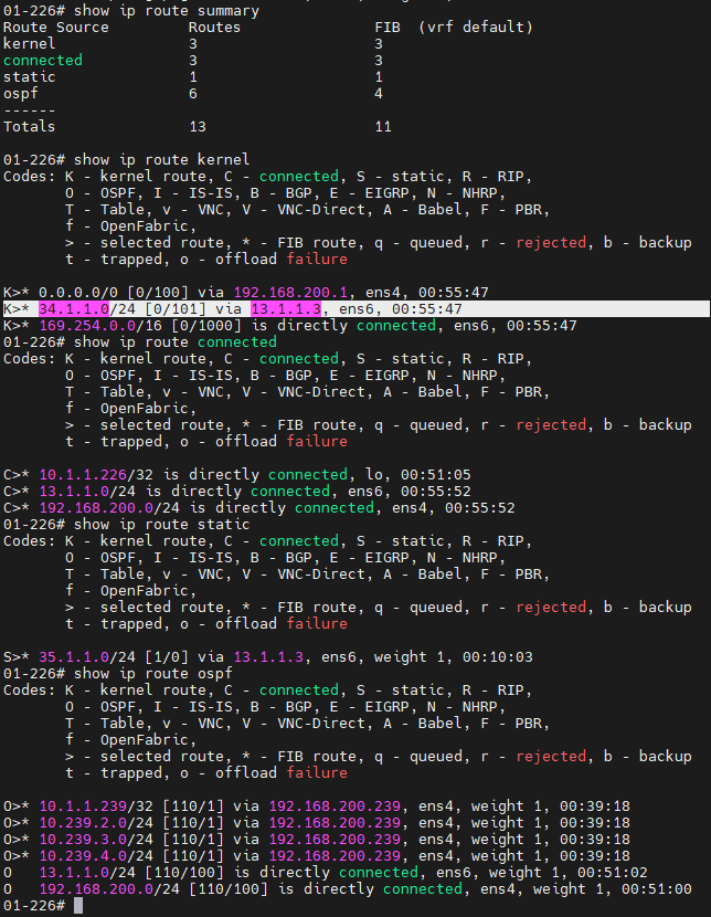 可以看到,当前系统中的路由被分成4类:默认路由和netplan配置的路由被归类为Kernel路由,直连路由即connected路由,在FRR中配置的静态路由才是static路由,还有和OSPF相关的ospf路由。