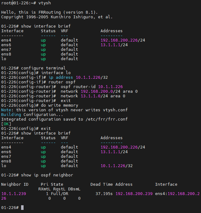 configure terminalinterface loip address 10.1.1.226/32router ospf ospf router-id 10.1.1.226 network 192.168.200.0/24 area 0 network 13.1.1.0/24 area 0 exitdo write memory