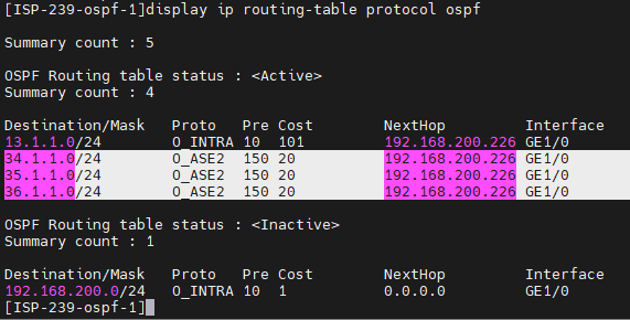 好了,都学习到了。其中34.1.1.0/24是通过netplan配置的静态路由,35.1.1.0/24是通过FRR配置的静态路由,36.1.1.0/24是通过内核ip route命令配置的静态路由,都被成功引入到了OSPF进程中。同时,我们也注意到,OSPF协议对自治系统内部路由的优先级为10,对引入的自治系统外部路由的优先级为150,这体现了OSPF内部优先的可靠性原则,细节处见真章。