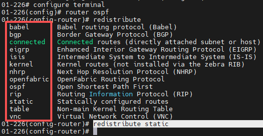 可以看到,FRR竟然支持引入13种类型的路由,涨姿势了!