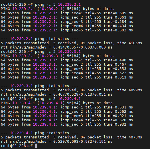 可以看到,Ubuntu的OSPF进程中学习到了3条24位的网段路由,并且同步到了内核的路由表中。简单测试一下连通性。