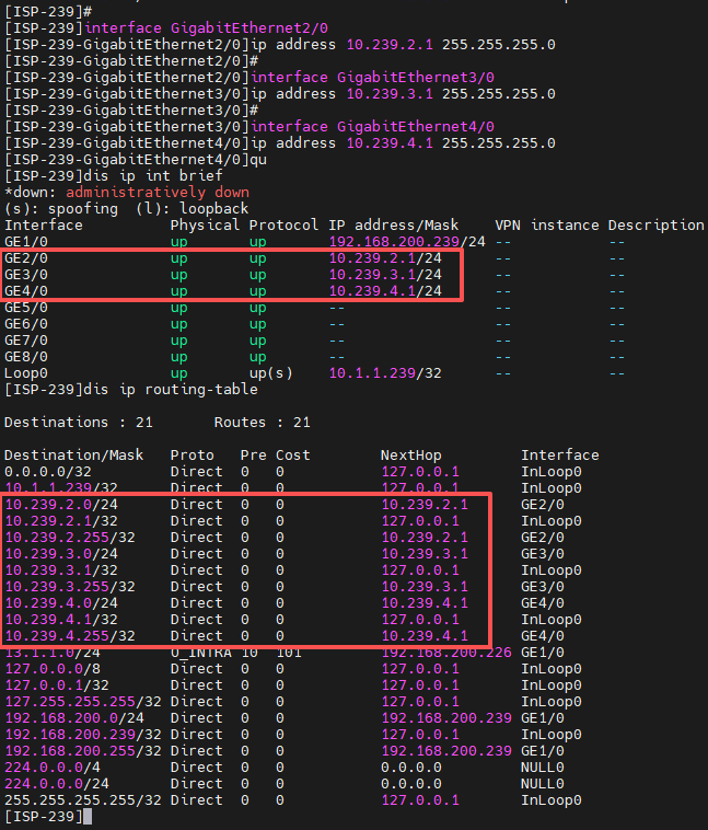 #interface GigabitEthernet2/0 ip address 10.239.2.1 255.255.255.0#interface GigabitEthernet3/0 ip address 10.239.3.1 255.255.255.0#interface GigabitEthernet4/0 ip address 10.239.4.1 255.255.255.0