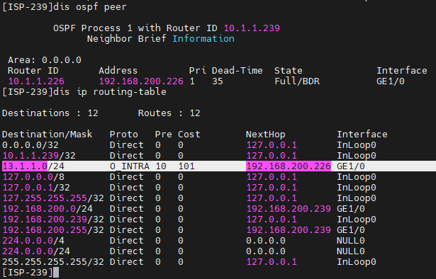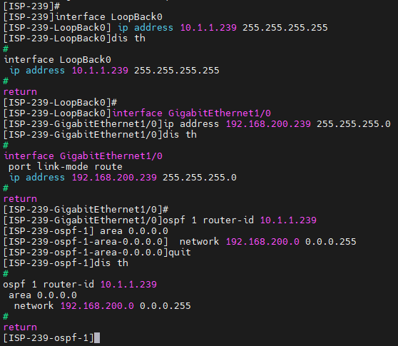 #interface LoopBack0 ip address 10.1.1.239 255.255.255.255#interface GigabitEthernet1/0 ip address 192.168.200.239 255.255.255.0#ospf 1 router-id 10.1.1.239 area 0.0.0.0 network 192.168.200.0 0.0.0.255