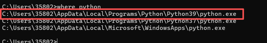 点击win+R打开输入框,输入cmd,打开终端,在终端中输入where python,就可以查看下载的所有python版本以及所在的位置
