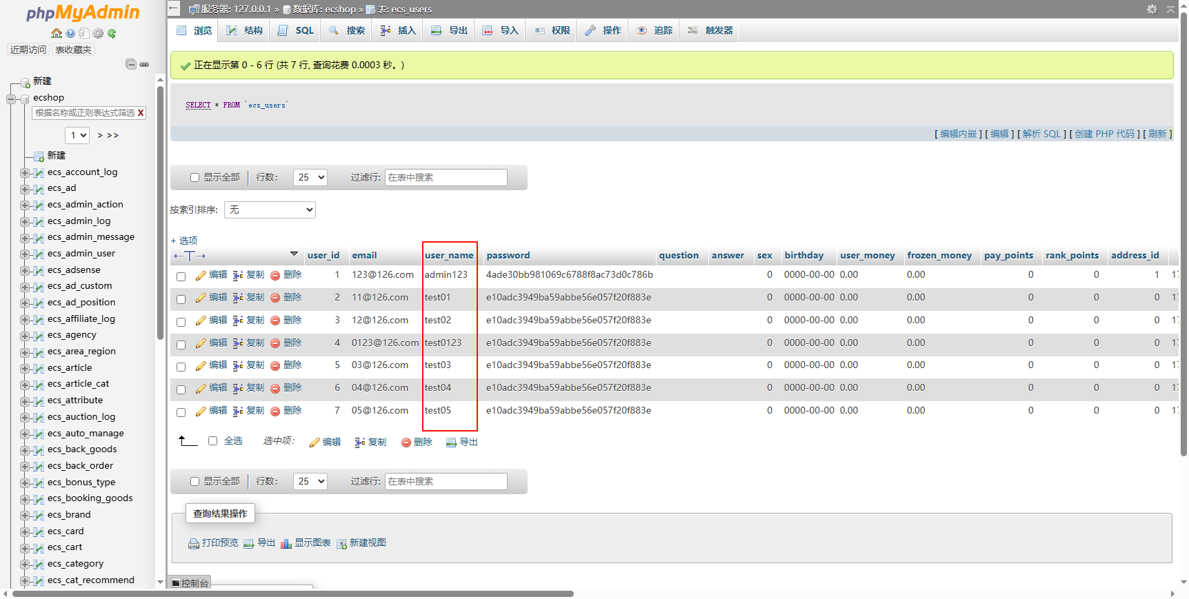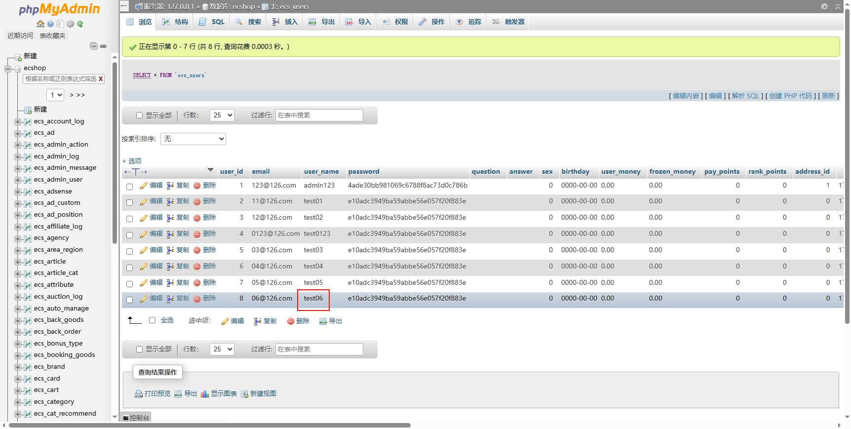 9、可以在 ecs_users 数据库表中查看到确实有 user_name 为 test06 这样的一条数据(自行使用数据库管理工具查看);