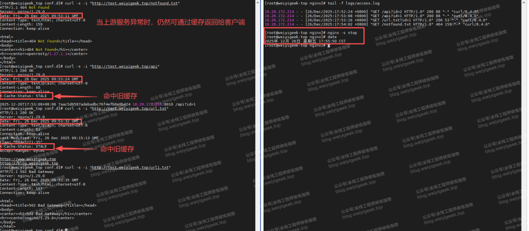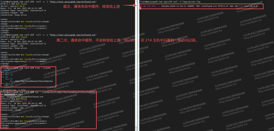 最后,访问一个不存在的文件curl -s -i "http://test.weiyigeek.top/notfound.txt,验证我们后端返回的 404 状态码,是否被缓存,以及请求是否被转发到上游。