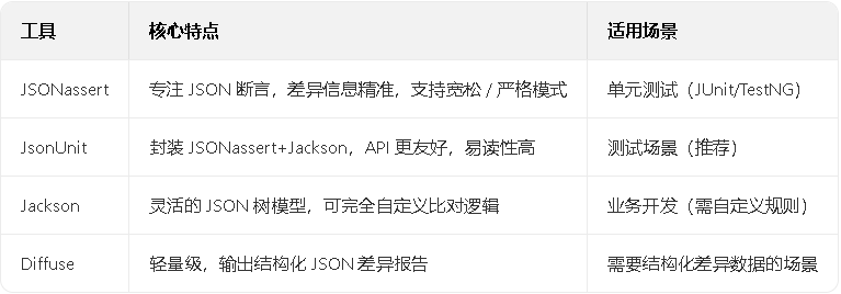 - 测试场景:优先选 JsonUnit(API 友好)或 JSONassert(轻量);