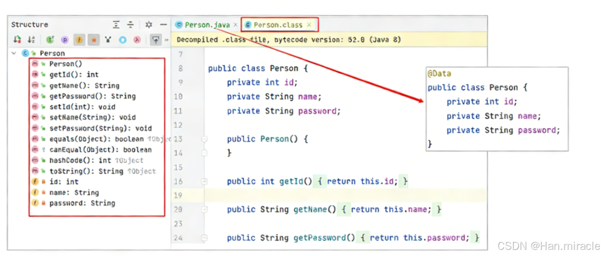 可以观察加了 @Data 注解之后,Idea 反编译的.