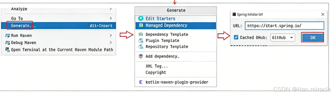 - 在pom.xml⽂件中,单击右键,选择Generate,操作如下图所示