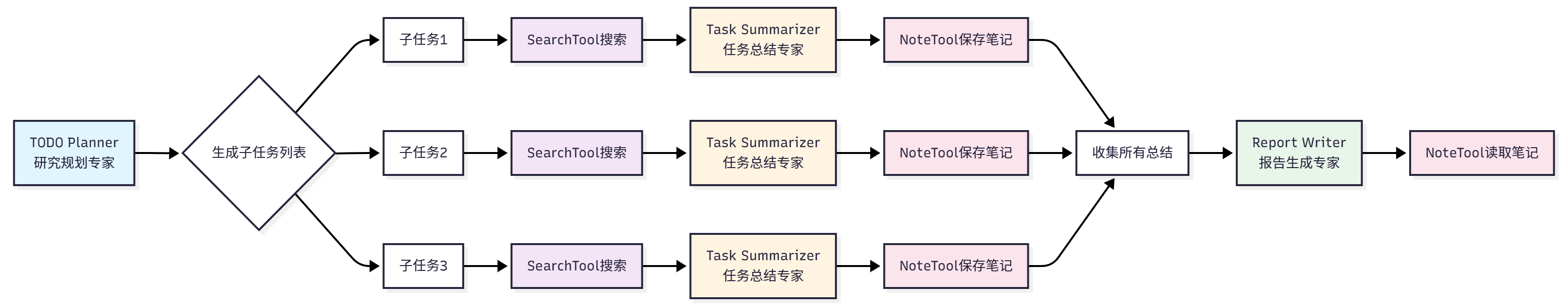 智能体层 (HelloAgents):三个专门 Agent(TODO Planner、Task Summarizer、Report Writer)+ 两个核心工具(SearchTool、NoteTool)