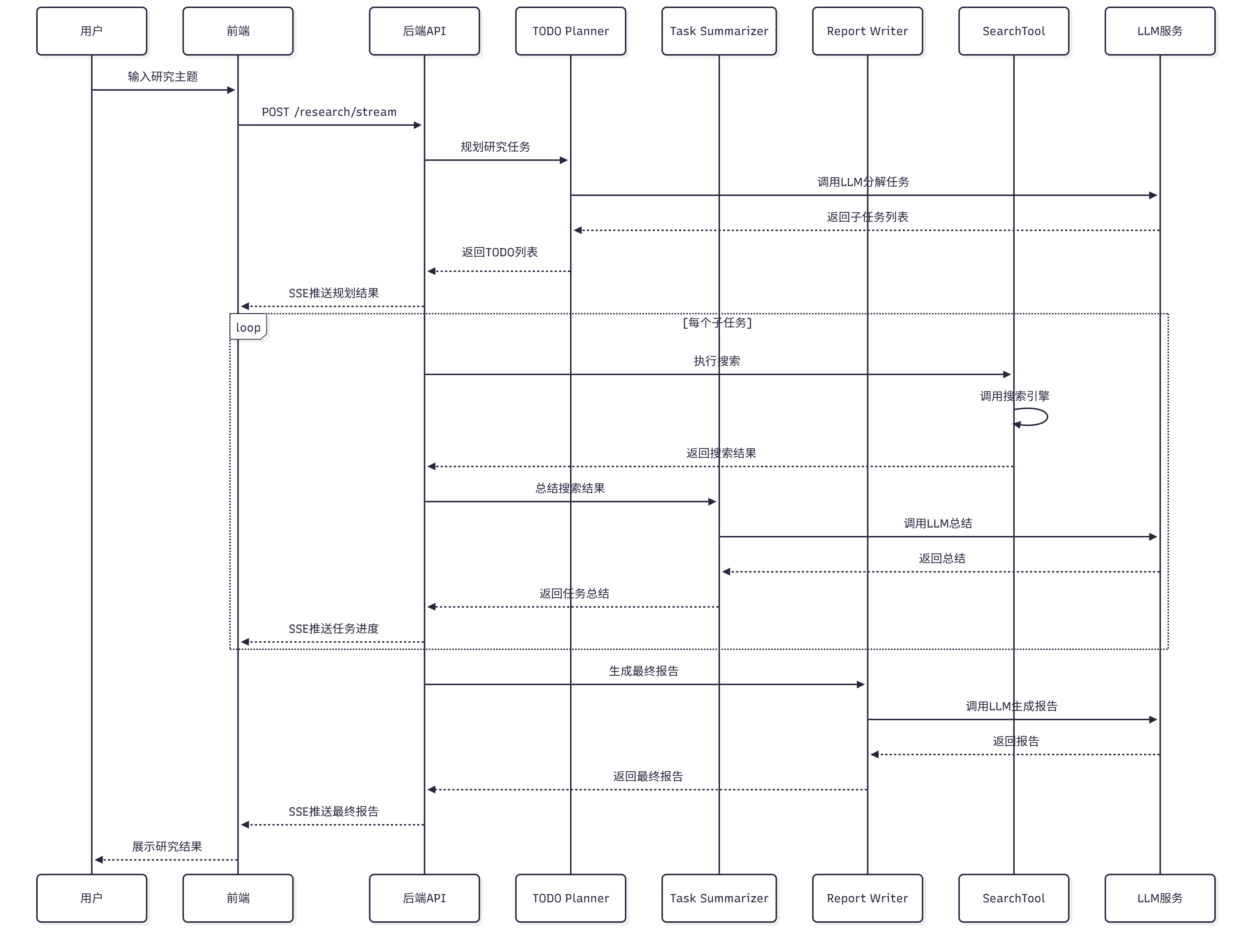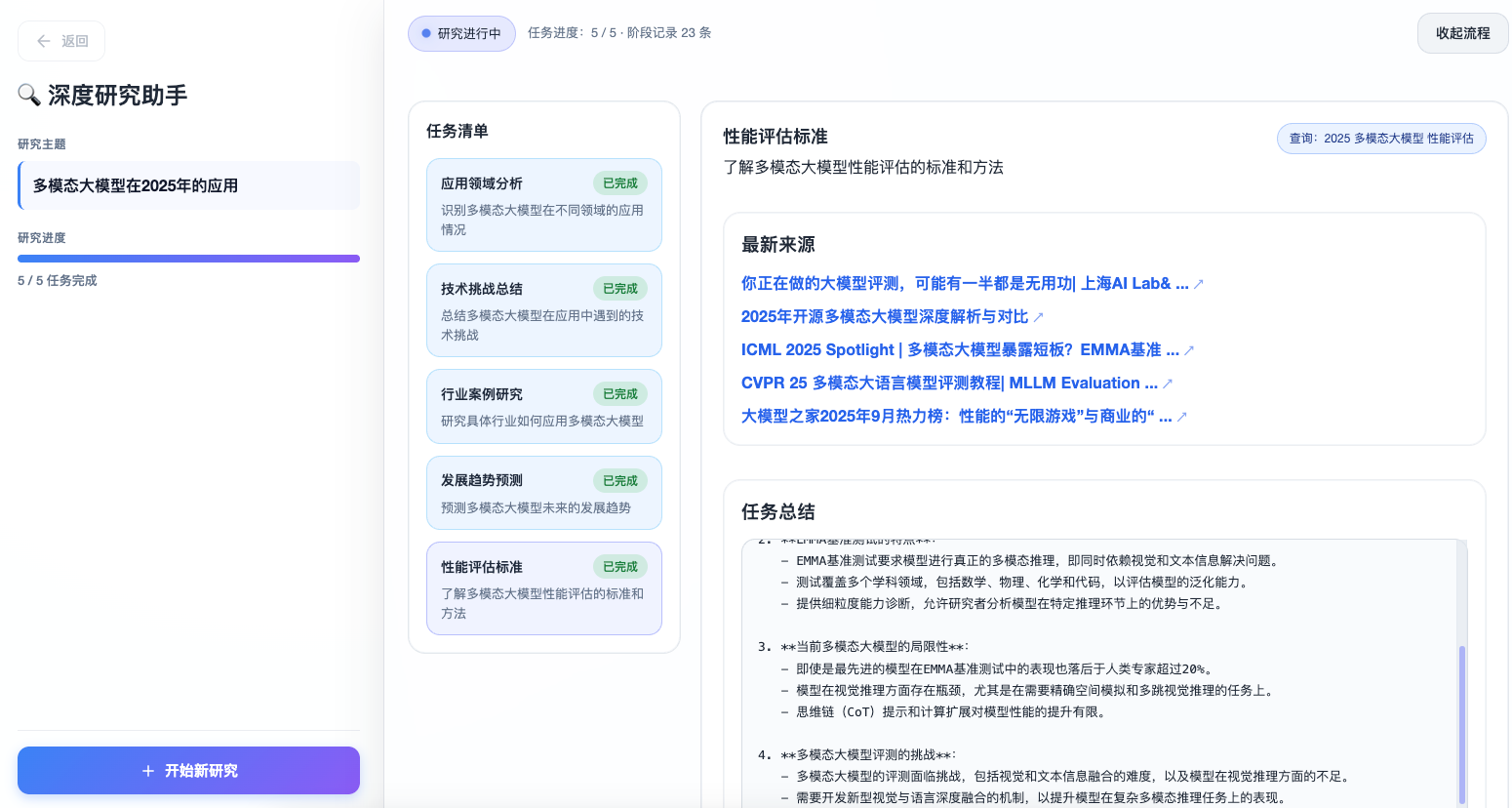 - SSE 实时进度:实时展示研究进度,用户体验良好