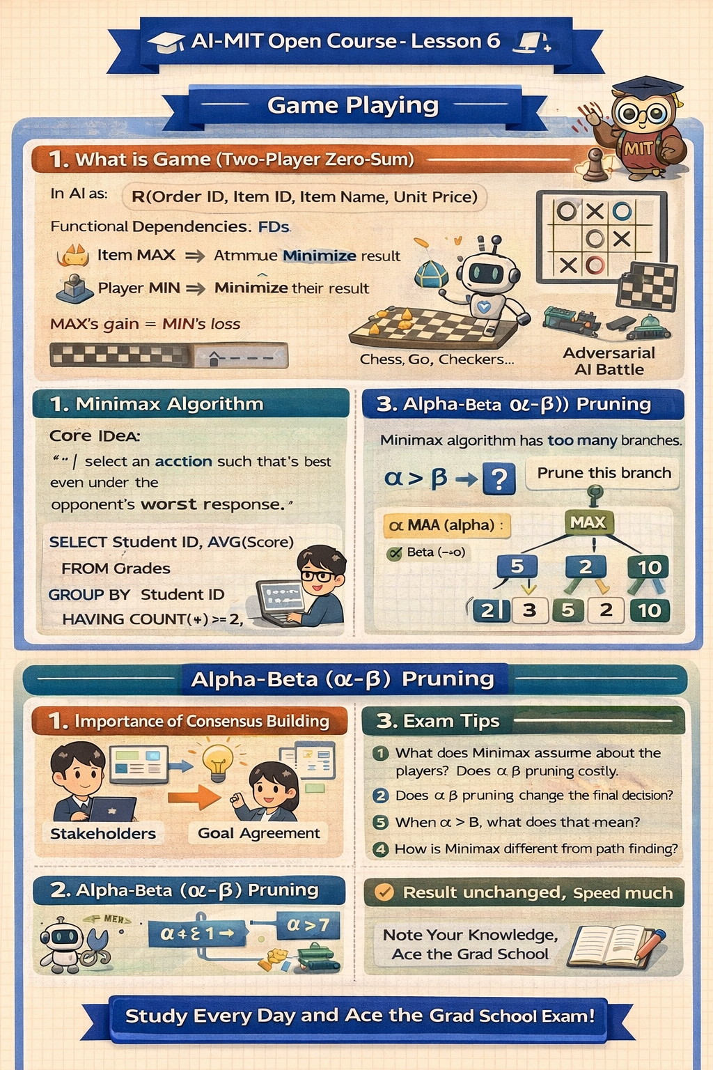 极小化极大法是一种用于两人零和博弈的对抗搜索方法,假设双方均理性行动,通过在 MAX 层选择最大值、MIN 层选择最小值来确定最优策略。α-β 剪枝通过维护 α 和 β 边界,在不影响最优解正确性的前提下减少搜索空间。