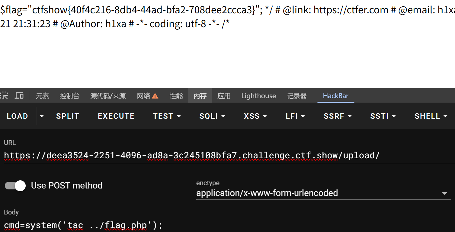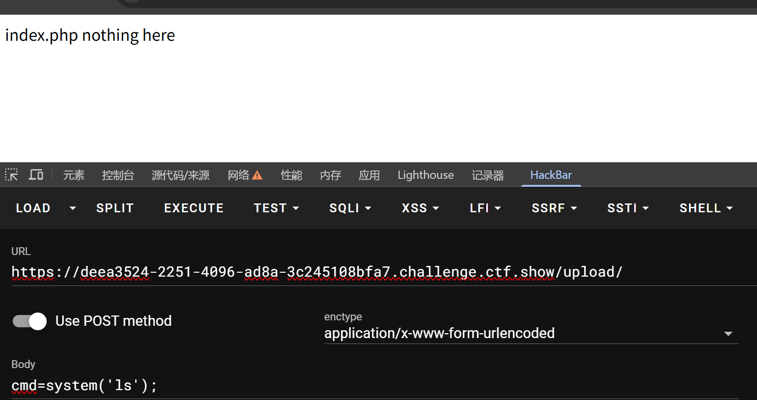 可以看到是没有报错的,可以连蚁剑或者直接hackbar里输入命令就行,这里我用hackbar: