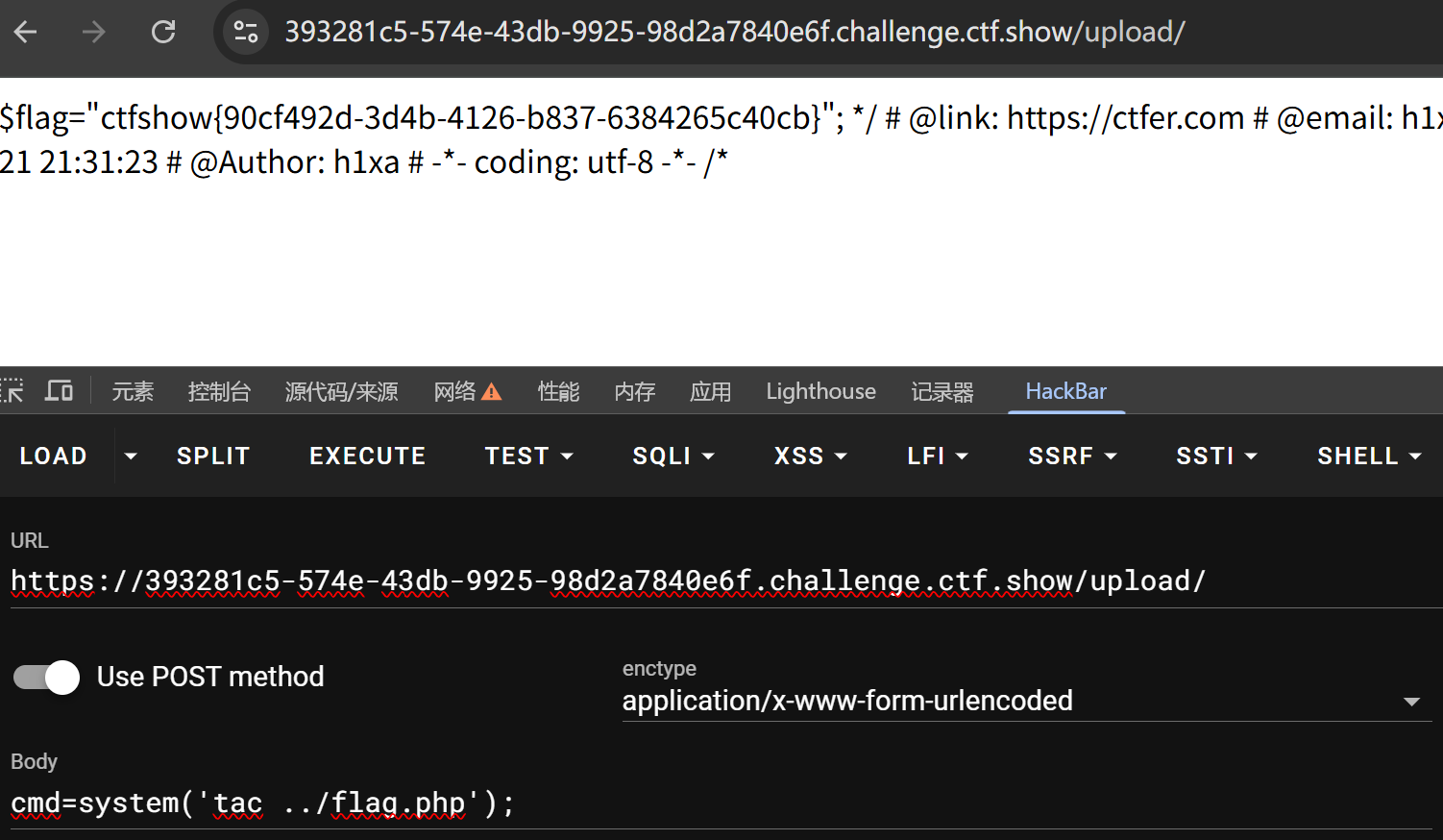 通过 auto_prepend_file,我们可以让 PHP 在执行脚本之前,主动去包含一个我们可控的文件。由于题目环境中 allow_url_include = On,这一包含可以是远程 URL,从而实现 RFI。