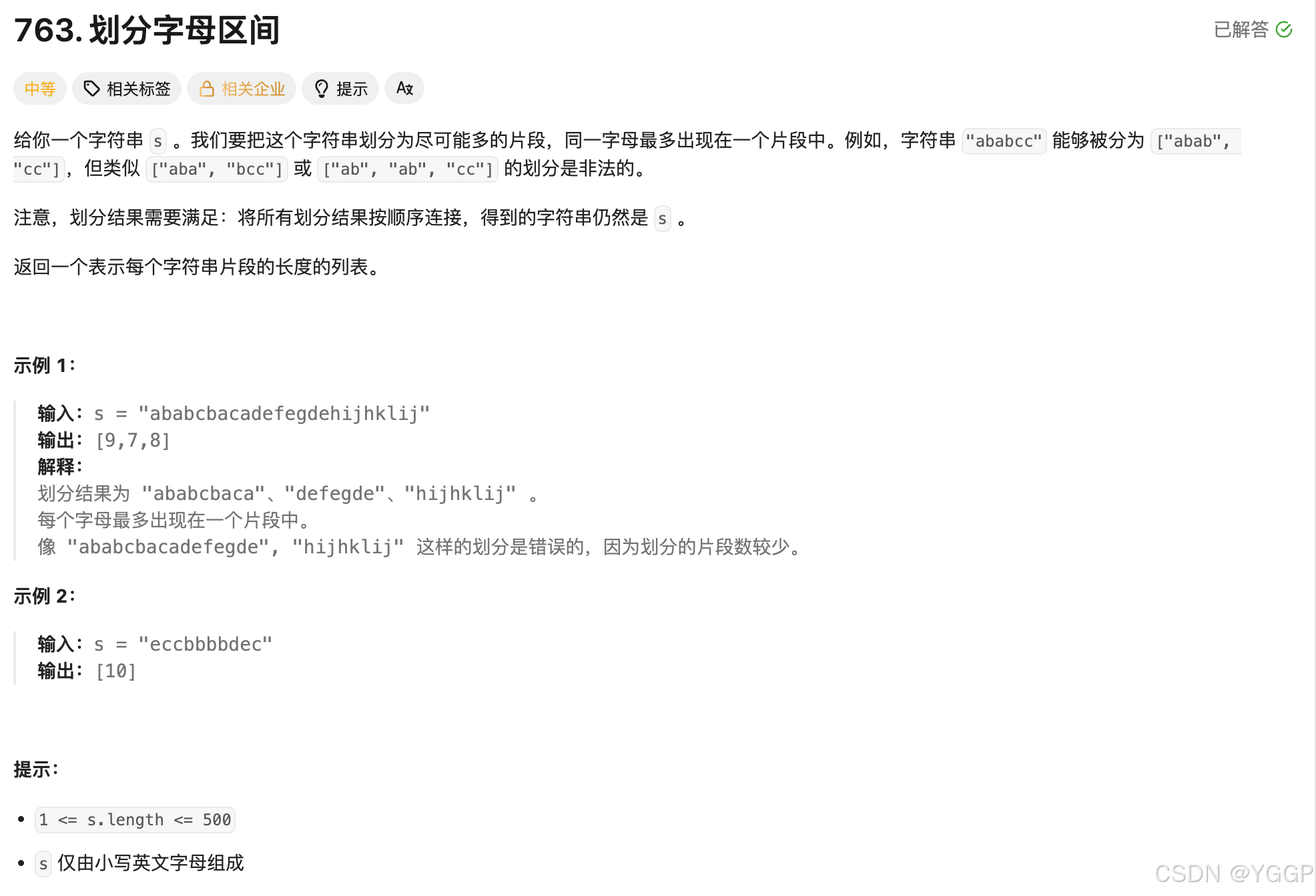 题目要求我们将字符串进行划分,要求不同的划分出的子串不互相包含本身带有的字符,比如:A = "abcdefg",那么B串就不能包含a / b / c / d / e / f / g这些字符。最终要求我们返回的是顺序划分得到的子串的长度。