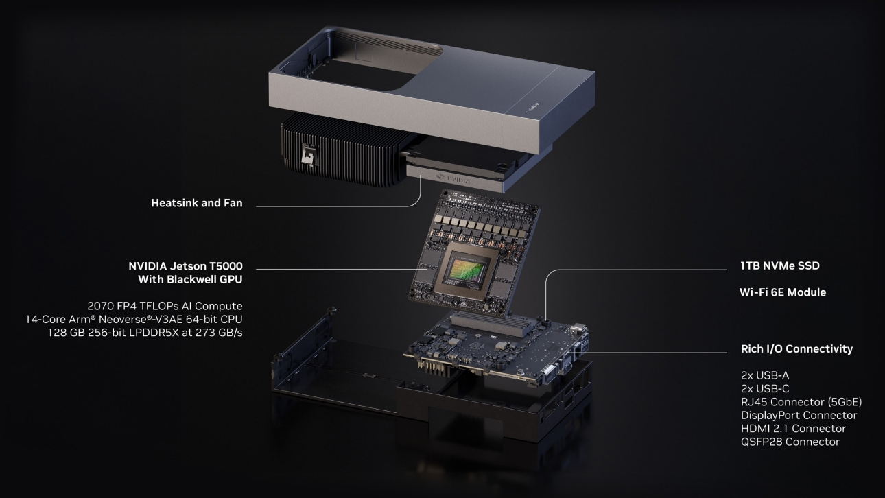 - Jetson T5000:旗舰型号,2070 TFLOPS AI 算力,128 GB 内存。