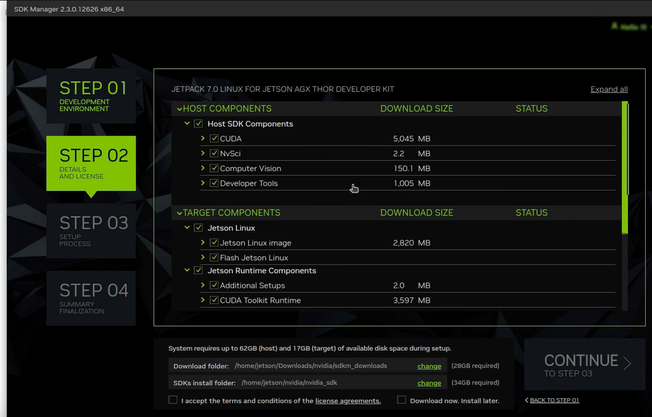 这时候将Thor开发板连通电源,并将用一根usb转type c的连接线连接我们的ubuntu系统电脑,然后按照下图选好后点击CONTINUE进入下一步。