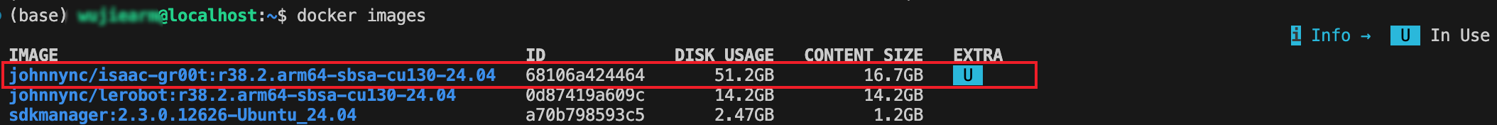 拉取完成后可以看到johnnync/isaac-gr00t:r38.2.arm64-sbsa-cu130-24.04镜像。