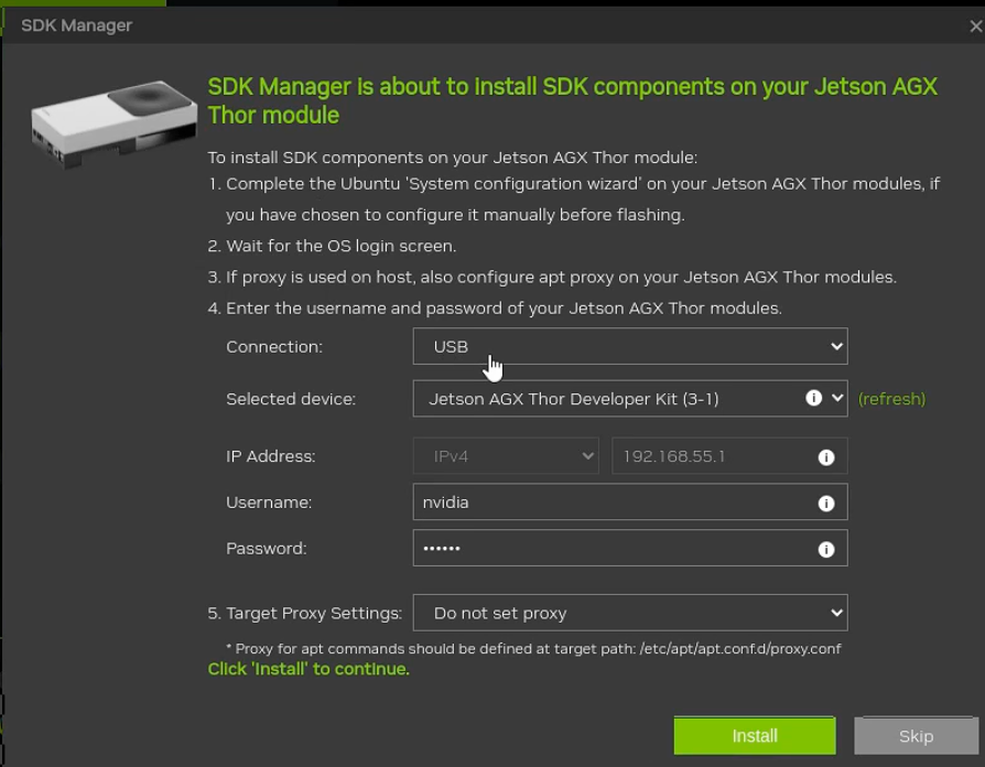 网上比较多的教程都是制作启动盘安装的,我这里就不再重复教学,大家可以参考https://blog.csdn.net/nenchoumi3119/article/details/151148194?spm=1001.2014.3001.5506和https://wiki.seeedstudio.com/cn/fine_tune_gr00t_n1.5_for_lerobot_so_arm_and_deploy_on_jetson_thor/#%E5%AE%89%E8%A3%85%E5%9F%BA%E6%9C%AC%E5%BC%80%E5%8F%91%E4%BE%9D%E8%B5%96%E9%A1%B9。