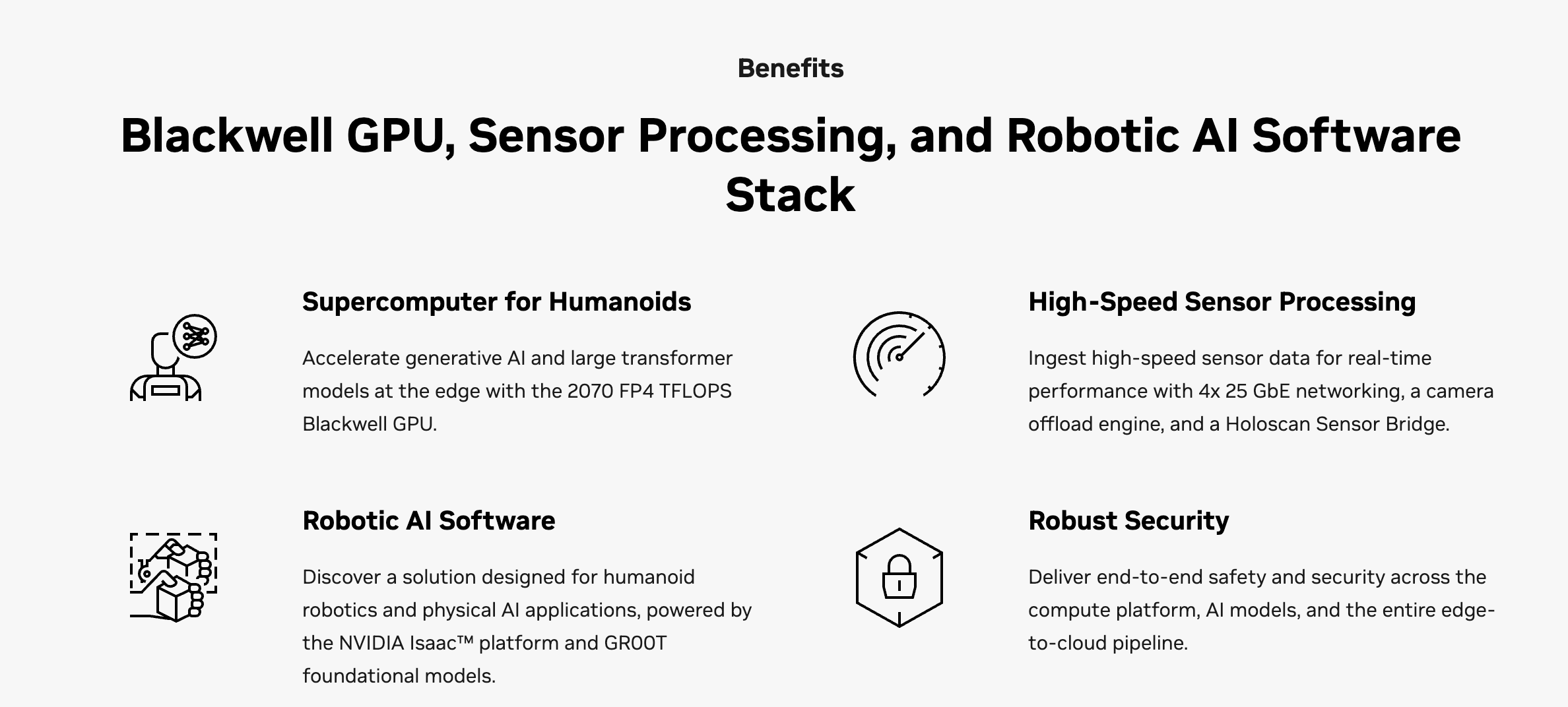 - Jetson AGX Thor:面向机器人开发者、学术界和工业界,侧重于边缘端通用 AI 和复杂机器人开发。