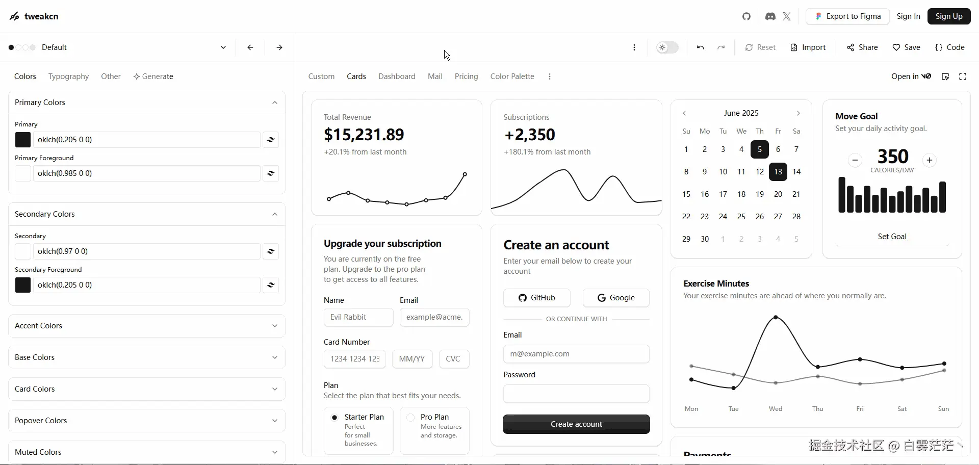 TweakCN 不仅界面简洁直观,更深度集成了 shadcn/ui 的设计规范,支持实时预览、一键导出 Tailwind CSS 配置及 CSS 变量定义。你可以自由调整主色、辅助色、语义色(如成功、警告、错误等),并自动生成适配深色/浅色模式的完整配色方案。更重要的是,它输出的代码可直接用于 Next.js 项目,配合 CSS 变量策略,轻松实现主题切换------无需手动计算颜色值或反复调试样式,极大提升了开发效率与设计一致性。对于希望快速定制品牌化 UI 风格的开发者来说,TweakCN 无疑是一个强大而贴心的助手。