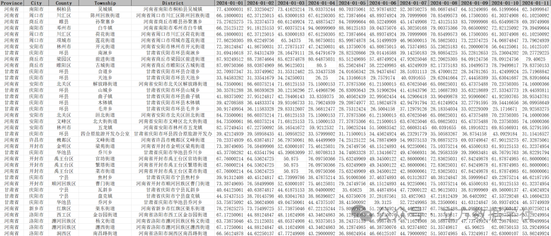 我们以乡镇级的逐日相对湿度数据为例进行预览,首先是Excel格式的数据,1951-2024年的逐日相对湿度数据按照年份进行汇总,每个Excel文件中的数据字段包括省份名称、城市名称、区县名称、乡镇名称、完整名称和各乡镇逐日相对湿度数据。