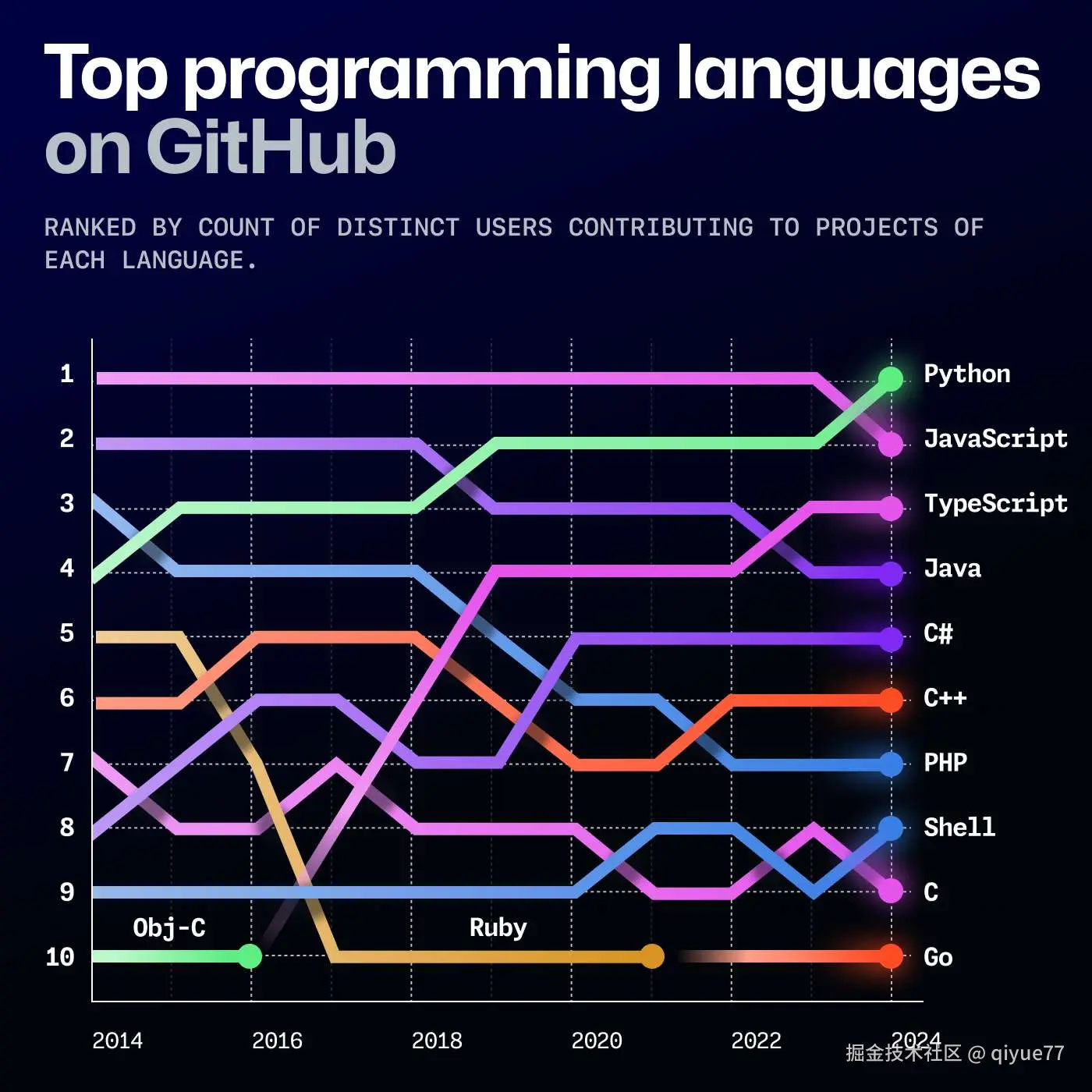 2024年,Python 大热荣登桂冠,JS/TS分别居于第二,第三。这么多年JS首次退下神坛,对于前端来说这就是最明显的信号。