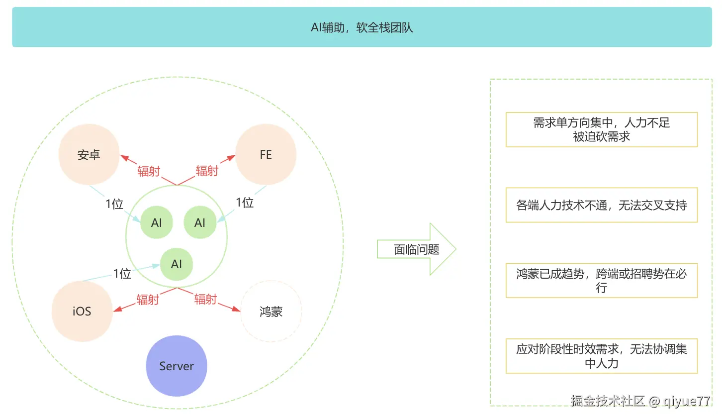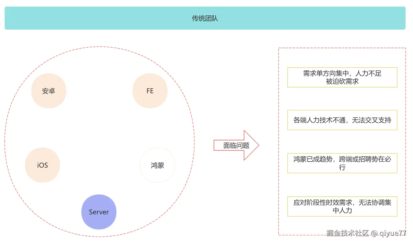 传统团队1是1,2是2,各个职能线之前没有交叉和转换的可能,除非招聘有实际多端开发经验的开发,在面对人力不足,实效性需求时,缺少灵活性。