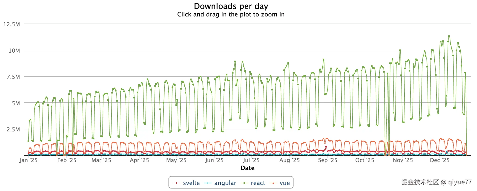 核心四大框架 React、Vue、Angular 和 Svelte。React 框架一骑绝尘,遥遥领先于其他三个框架。Vue 框架则处于第二的位置。Svelte 已超过 Angular