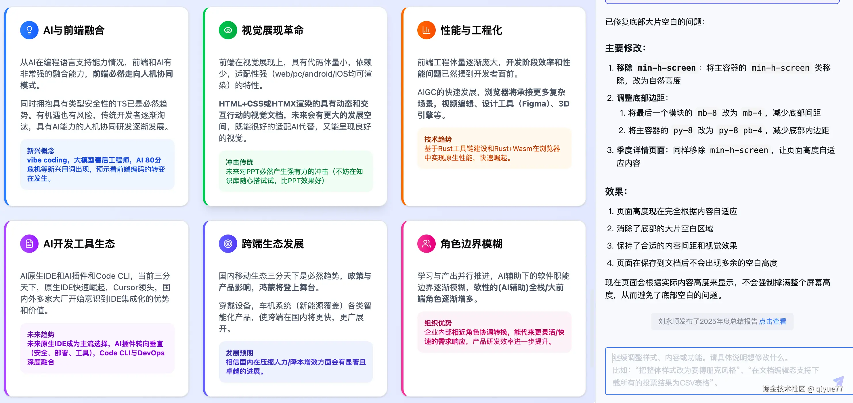 前端在视觉展现上,具有代码体量小,依赖少,适配性强(web/pc/android/iOS均可渲染)的特性,HTML+CSS或HTMX渲染的具有动态和交互行动的视觉文档,未来会有更大的发展空间,既能很好的适配AI认知理解,又能呈现良好的视觉,未来对PPT必然产生强有力的冲击。(不妨在知识库随心搭试试,比PPT效果好)