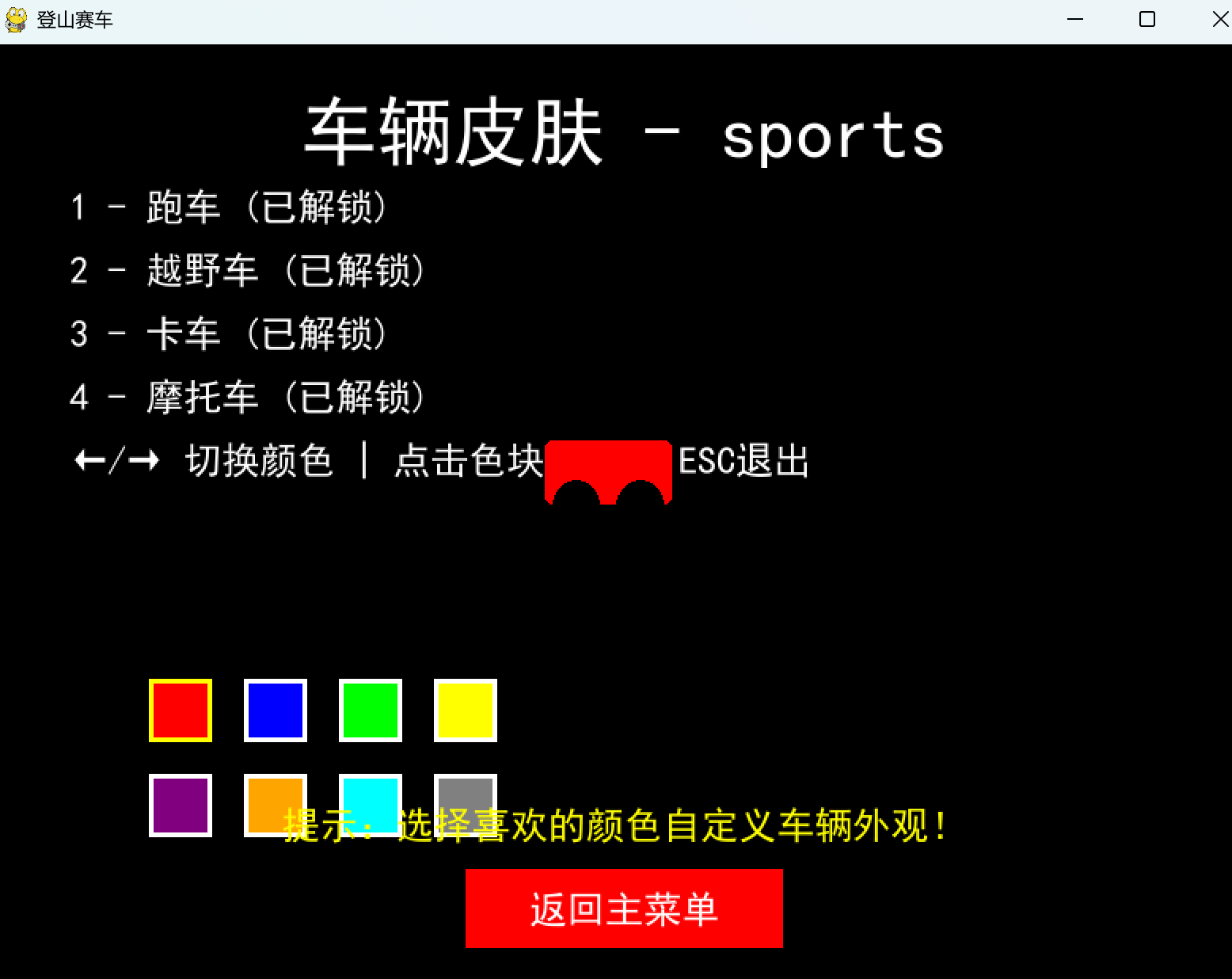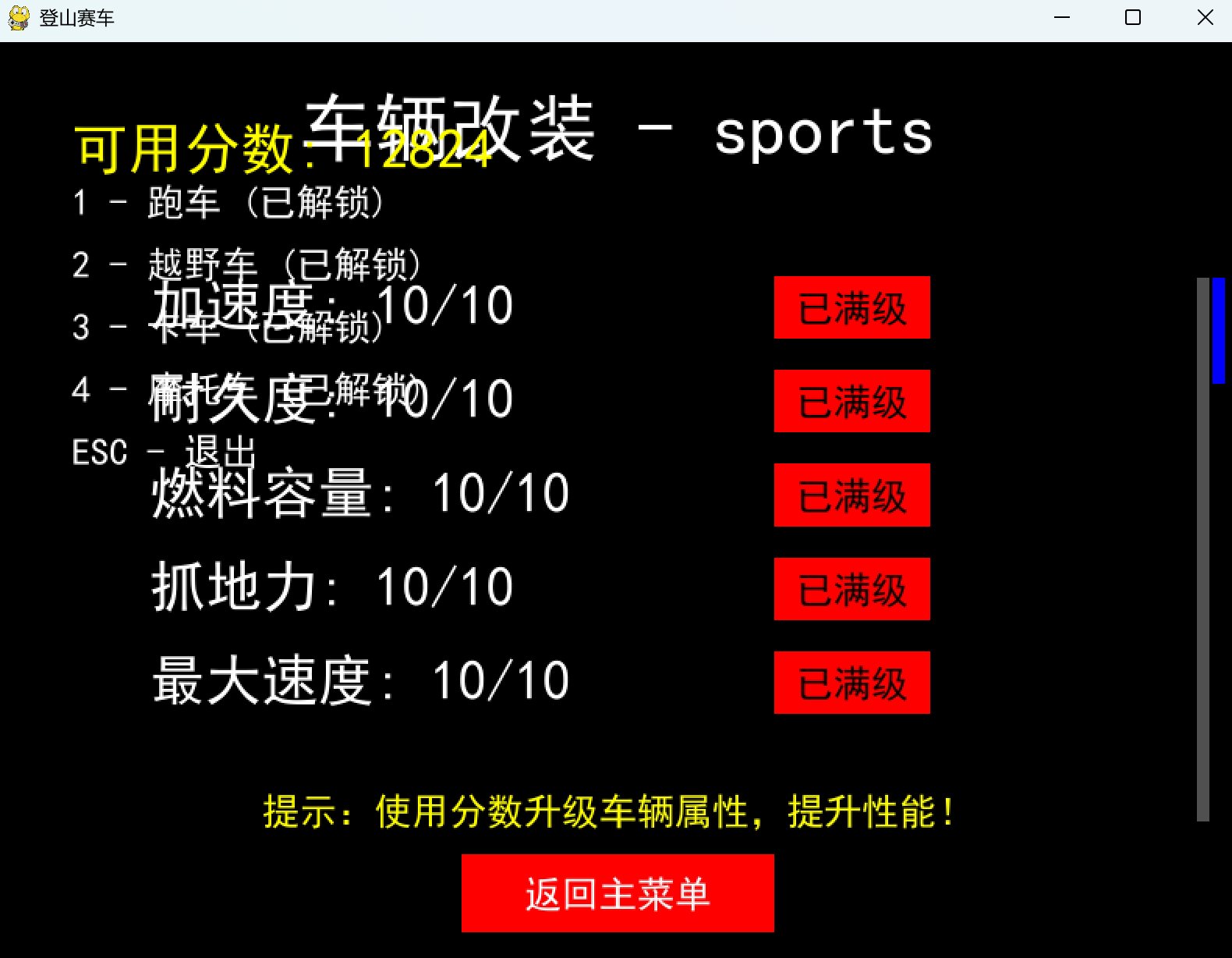 - 主菜单:通过 Pygame 绘制按钮(开始游戏 / 车辆改装 / 退出),处理鼠标点击事件;