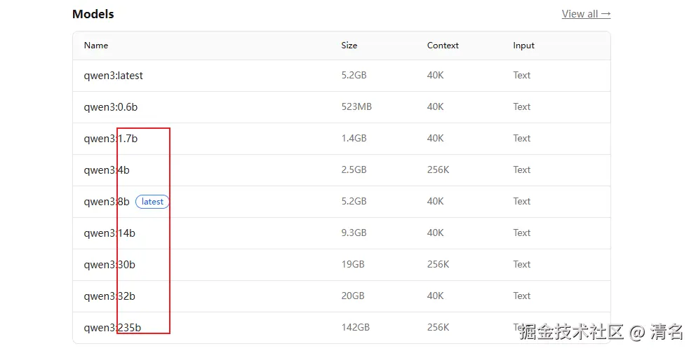 这些大模型中都带有个"b",这个b表示十亿的意思。0.6b则表示6亿个参数,参数越多表示功能越强大。