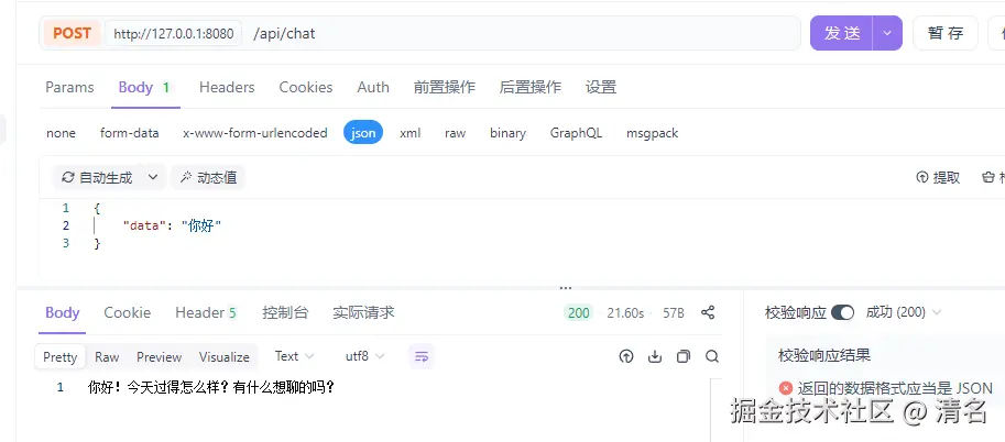在原来的controller中,将OpenAiChatModel替换为AiChatService,重启成功后,并进行对话,模型同样返回了结果。