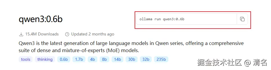 选择对应的模型后,进入详情可以查看ollama的安装命令。将该命令复制后进行安装。