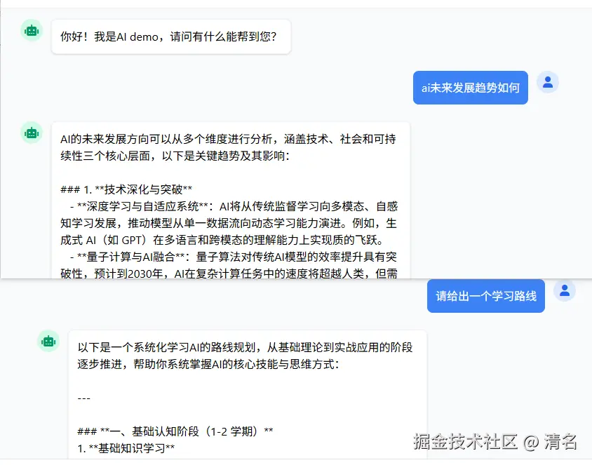 上面响应的内容不太美观,那我们自己可以实现一个简单的前端页面来模拟ai智能问答(网上找一个模板或者ai生成一个就行,没必要在这个上面浪费时间)。虽然回复有些卡顿,但作为古董级的笔记本部署0.6b的模型效果也算不错了😔😔😔。