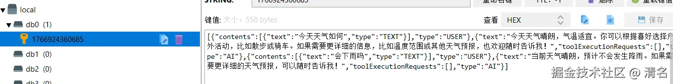 配置完成后,当再次发起对话时,对话的内容已经被存储到redis当中了,这样即使重启,也不会导致记忆内容丢失。