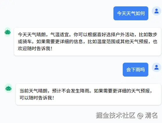 当重新运行后在进行同样的提问,可以看出来模型已经根据会话记忆的上下文进行理解并准确的回答问题了。