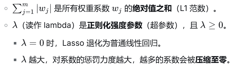 Lasso回归会对模型所有权重系数的绝对值之和进行惩罚,从而约束模型的复杂度。这个惩罚项会促使模型自动将不重要的特征对应的系数压缩为零(稀疏化)。