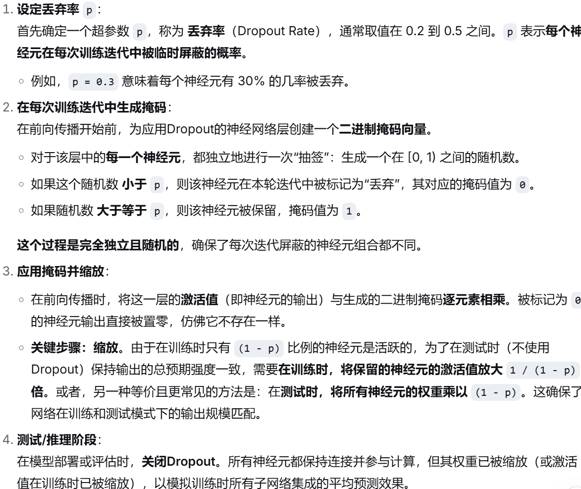 Dropout 是一种在神经网络训练过程中使用的正则化技术,其核心思想是在每次前向传播时,随机"丢弃"网络中一定比例的神经元(通常包括其输入和输出连接)。这种随机屏蔽迫使网络不能过度依赖任何一个或一组特定的神经元,因为它们在每次训练迭代中可能被禁用,从而鼓励网络学习到更鲁棒、更分散的特征表示。