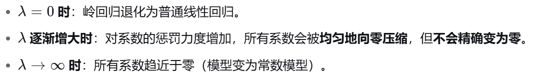 岭回归通过对模型所有权重系数的平方和 进行惩罚,从而约束模型的复杂度。这个惩罚项会使所有系数同时缩小,但不会将任何系数压缩至零。